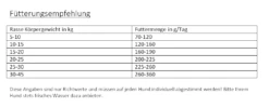 Mais getrocknet, Geflügelfleischmehl (15%), Reis getrocknet, Rübentrockenschnitzel, Geflügelfett, Hydrolisiertes Geflügeleiweiß, Leinsamen getrocknet, Johannisbrot getrocknet, Fischmehl, Bierhefe getrocknet, Volleipulver, Mineralstoffe, Hydrolisierter Fischknorpel (als Quelle von Chondoitin) (0,05%), Hydrolisierte Krustentiere (Muschelfleisch) getrocknet, (als Quelle von Glucosamin) (0,05%), Lecithin (0,05%), Chicoreepulver (als Quelle von Fructo-Oligosacchariden) (0,05%)