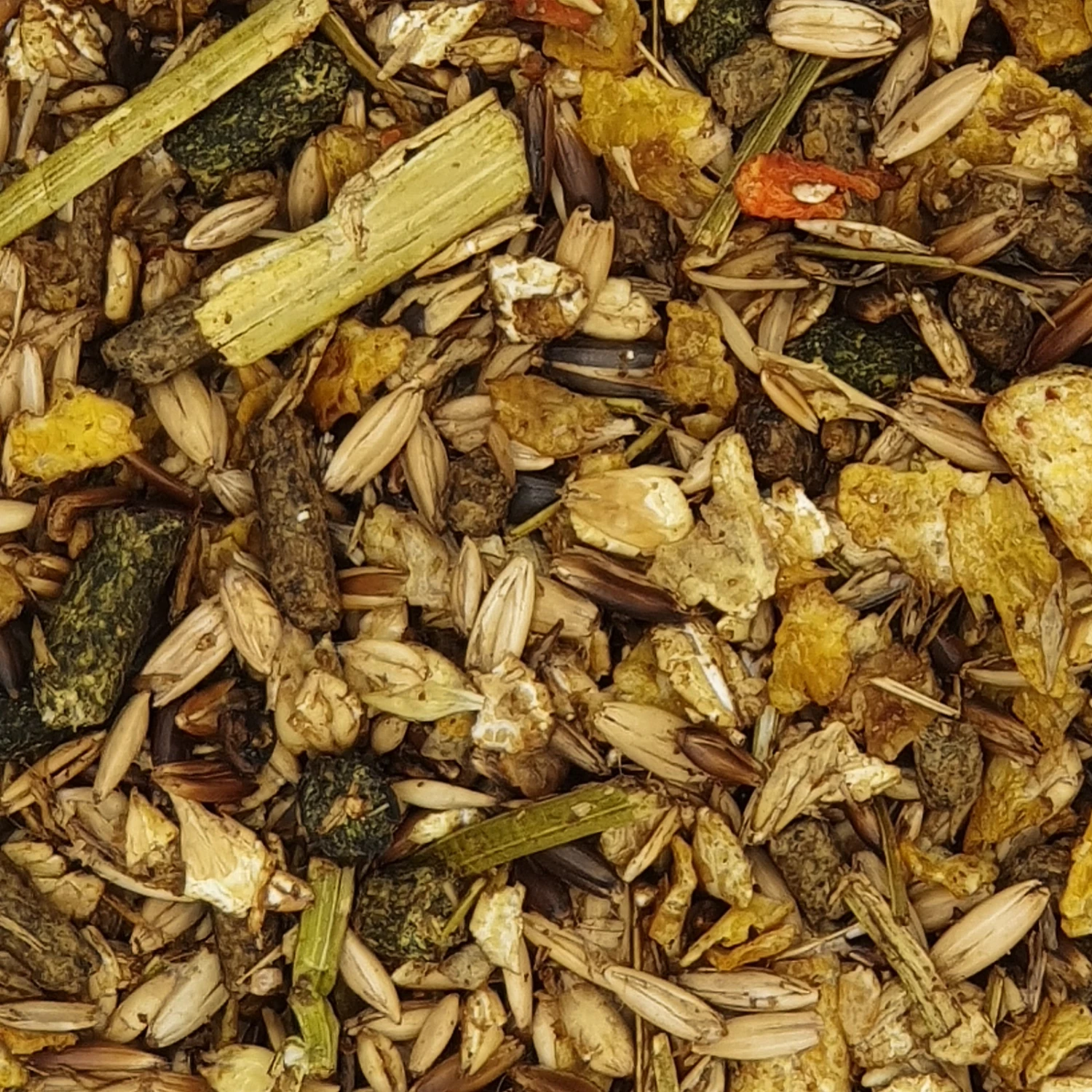 Das natürliche und gesunde Kräuter-Müsli The Green Vet besteht vor allem aus hydrothermisch aufgeschlossenem Getreide (Mais, Gerste, Vollkornhafer und Weizen), Luzernen und Karottenflocken, sowie einem Vitaminpellet. Ergänzt mit hochwertigen Naturkräutern und ätherischen Ölen ist es leichtverdaulich, 100% natürlich und besonders schmackhaft.